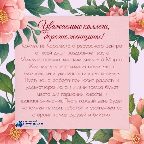 Без рубрики Мар 8 2026 Поздравляем с 8 марта! Уважаемые женщины!От всей души поздравляем вас с Международным женским днём — 8 Марта!🌷С праздником весны и красоты! Карельский ресурсный центр 0 Комментарии
