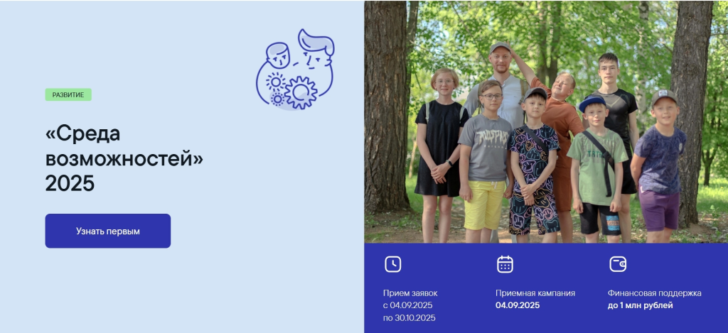 Конкурс «Среда возможностей» направлен на поддержку организаций, которые создают условия для развития и самореализации детей и подростков на малых территориях, внедряют новые практики и услуги в работе с детьми, учитывая их потребности, интересы и идеи, вовлекают в совместную деятельность.