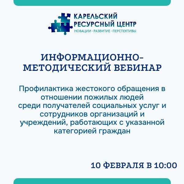 Напоминаем, что 10 февраля в 10:00 состоится информационно-методический вебинар по теме: «Профилактика жестокого обращения в отношении пожилых людей среди получателей социальных услуг и сотрудников организаций и учреждений, работающих с указанной категорией граждан»