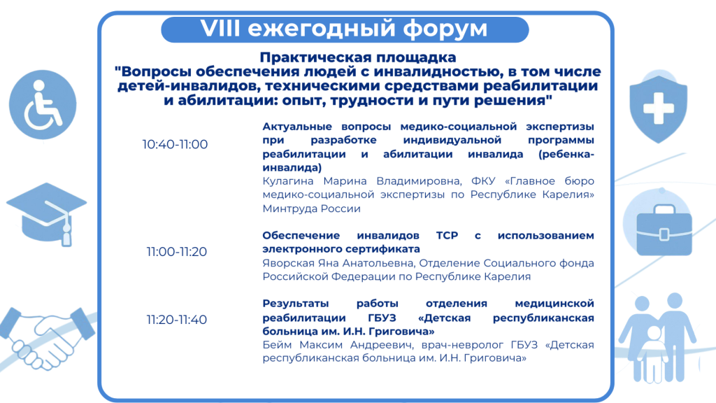 В рамках работы площадки обозначен комплекс проблем по вопросам медико-социальной экспертизы, подбора и обеспечения техническими средствами реабилитации детей и взрослых с инвалидностью, выработаны пути преодоления барьеров. В работе площадки примет участие эксперт Федерального методологического и методического центра развития сопровождаемого проживания инвалидов ФГУБУ Федеральный научно-образовательный центр МСЭ и реабилитации имени Г. А. Альбрехта Минтруда России.
