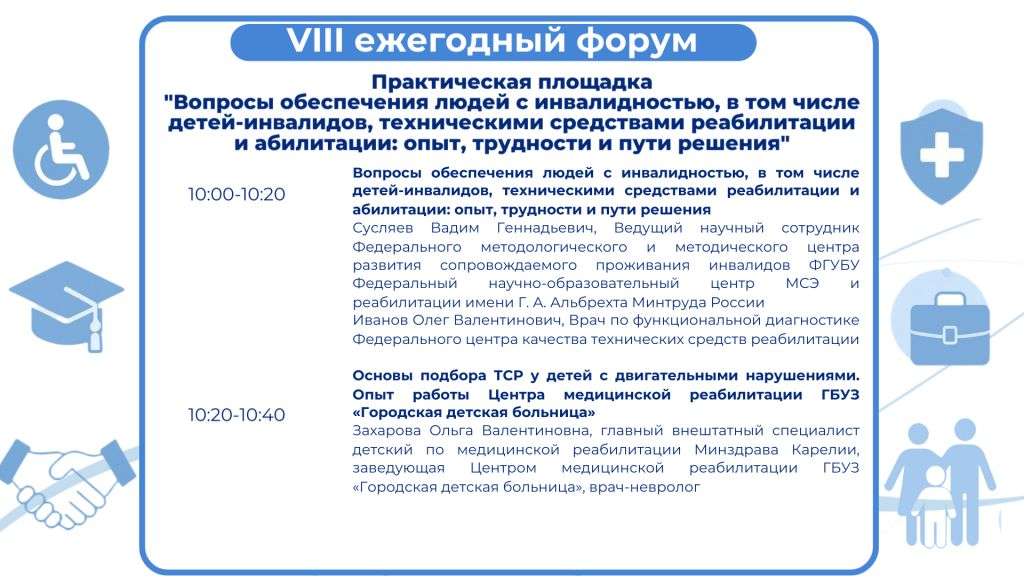 ГБУЗ «Детская республиканская больница им. И.Н. Григовича» (г. Петрозаводск, ул. Парковая, 58, (поликлиника (2 этаж))В рамках работы площадки обозначен комплекс проблем по вопросам медико-социальной экспертизы, подбора и обеспечения техническими средствами реабилитации детей и взрослых с инвалидностью, выработаны пути преодоления барьеров. В работе площадки примет участие эксперт Федерального методологического и методического центра развития сопровождаемого проживания инвалидов ФГУБУ Федеральный научно-образовательный центр МСЭ и реабилитации имени Г. А. Альбрехта Минтруда России.